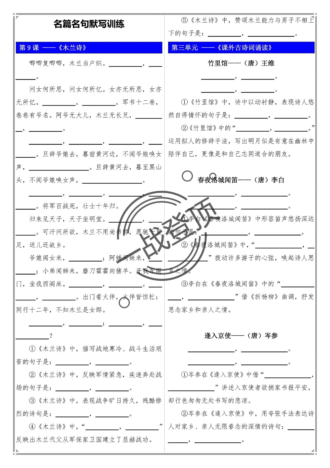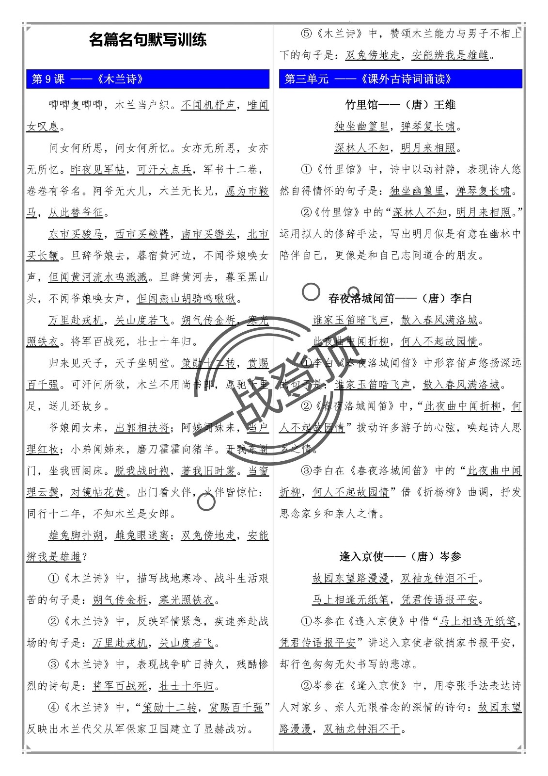 部编版新教材七年级下册语文——名篇名句默写(含答案)